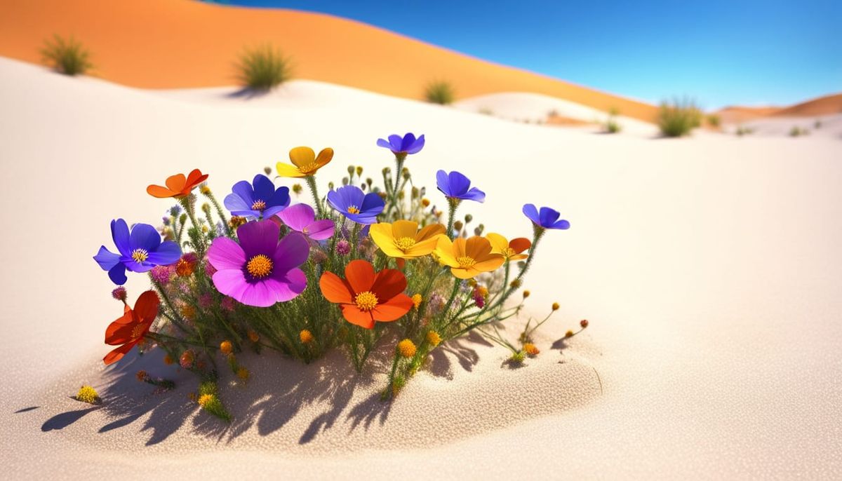 This image showcases vibrant, colorful wildflowers growing in sand, each protected by a bubble from the harsh desert sun. Captured with a 3D effect and depth of field, it evokes a sense of calm and fantasy.