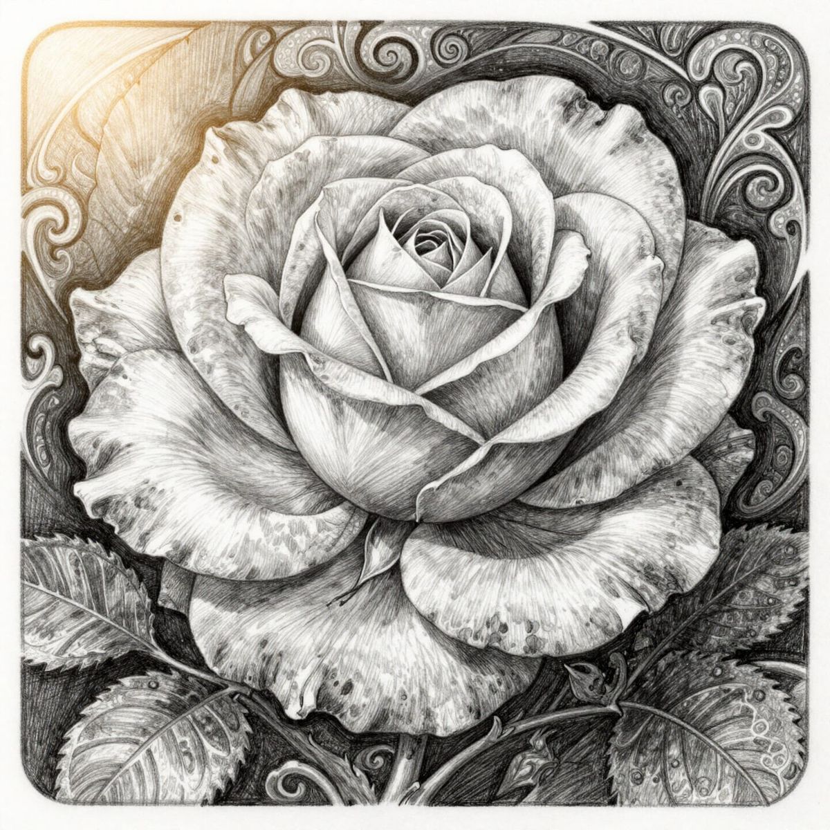 This image showcases a hyperdetailed black and white pencil drawing of a single rose in the Art Nouveau style, featuring flowing lines and decorative elements with dramatic lighting and a subtle golden glow.
