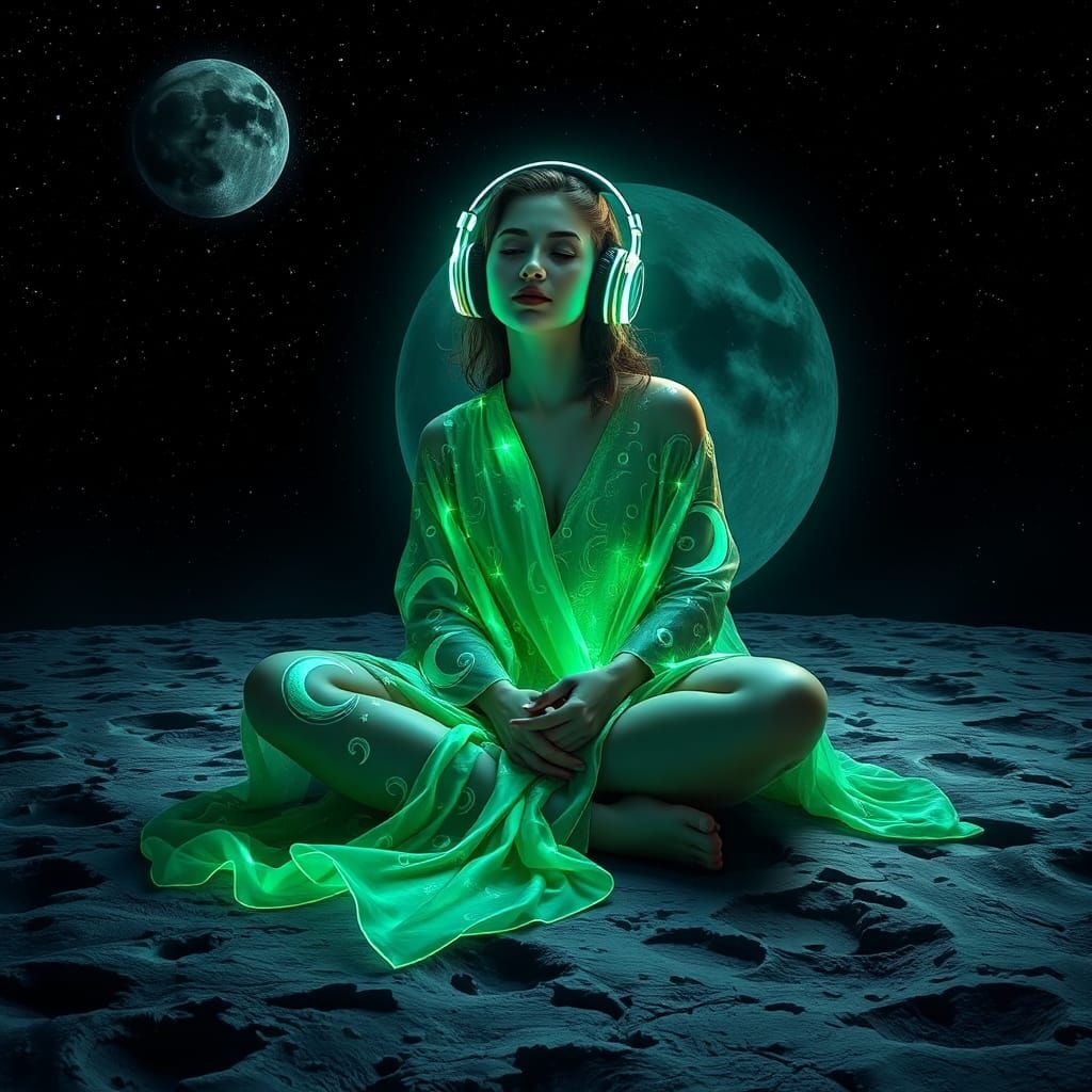 This image shows a woman on the moon, listening to music. She is wearing a flowing green dress and retro headphones. The style evokes Art Nouveau with a modern digital aesthetic.