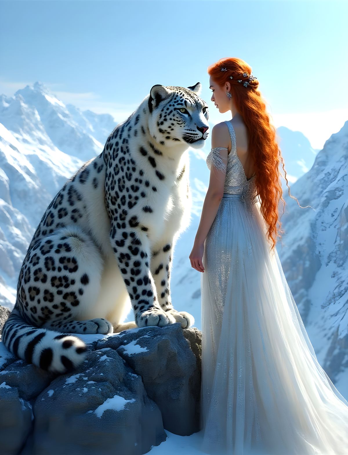 A hyperrealistic image of a snow leopard and an elven queen on a mountain peak. The queen wears a silver gown, her red hair braided. Snow-covered peaks fill the background in this detailed wildlife scene.