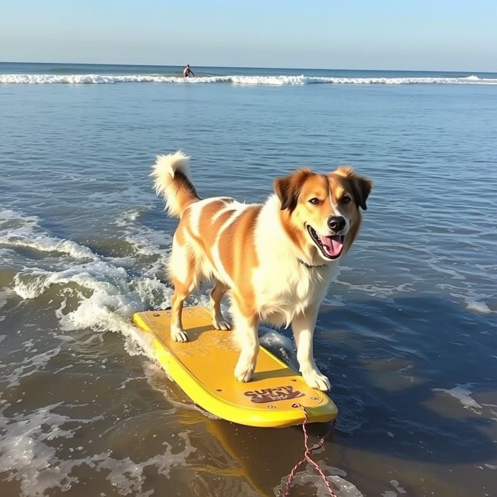 A vibrant image of a dog surfing on a wave, captured in a playful and energetic style reminiscent of beachside fun and outdoor adventure.