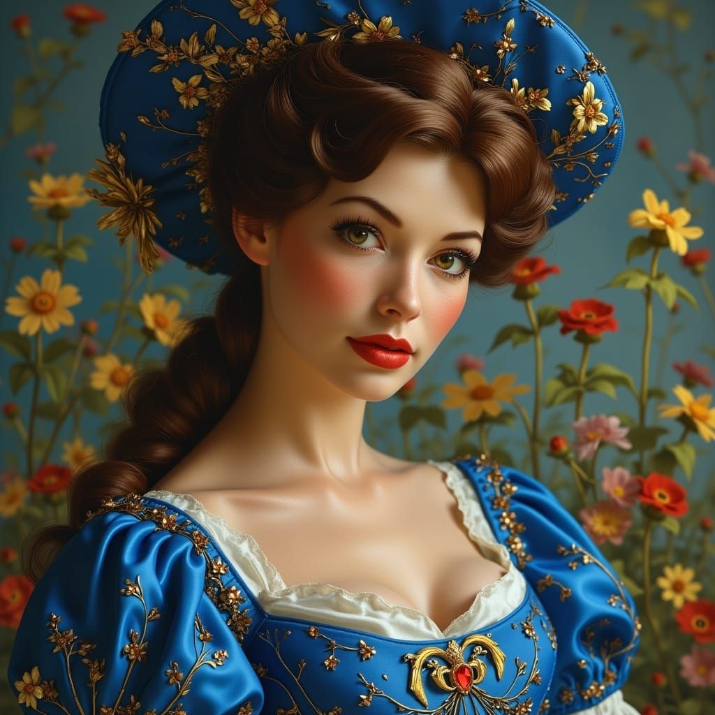 doe and beautiful Scarlett O'Hara in constellation, beautiful eyes, plump lips, hair up in a bun, hat, a long blue luxurious dress woven from small dots connected into a constellation, bodice covered big color red Royal precious stones, stands on the scales, spring , beautiful garden flowers <lora:MidjourneyBeauties:1.0> ...
