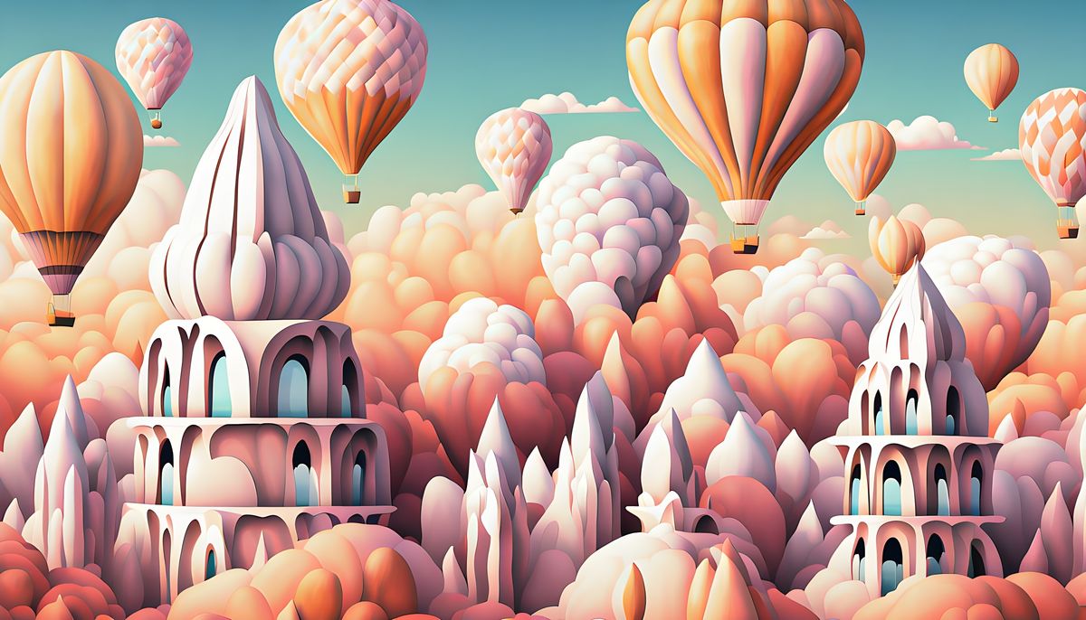 This image shows a dreamlike scene of colorful hot air balloons flying high above a vibrant Utah desert landscape, evoking a sense of wonder and freedom, in a psychedelic art deco style