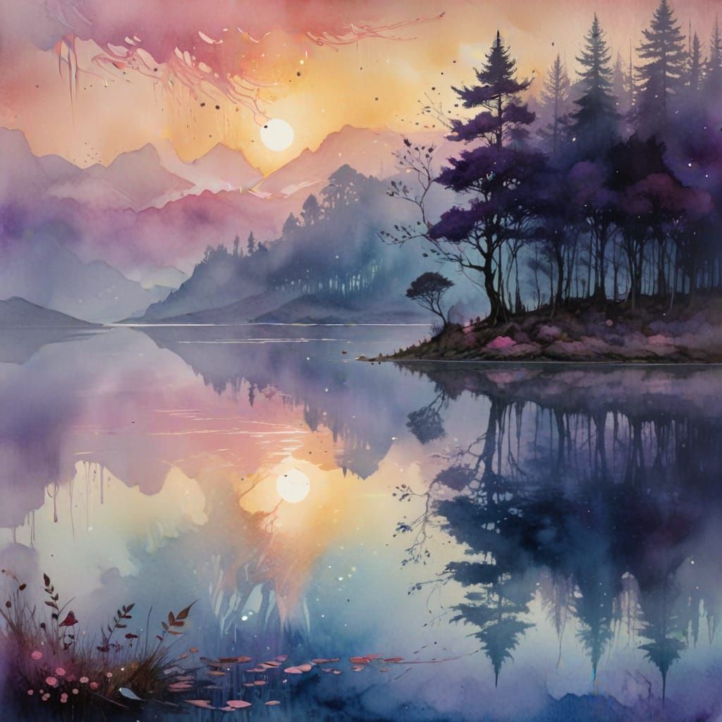 This enchanting watercolor landscape features a dreamy, ethereal quality with dominant hues of pink and purple, reminiscent of Impressionist techniques.