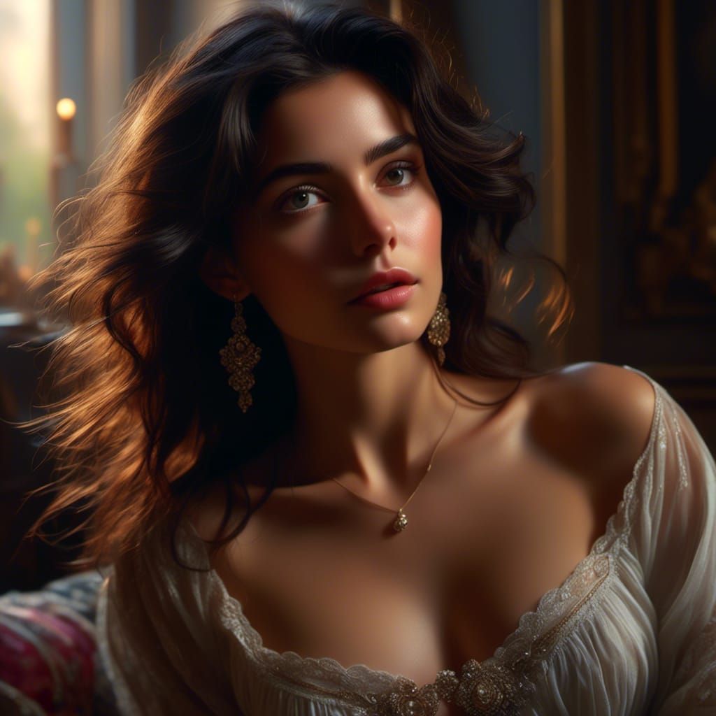 This image shows a hyperrealistic portrait of a beautiful dark-haired Italian woman in her apartment. The artwork is highly detailed, emphasizing her pretty features and chest.