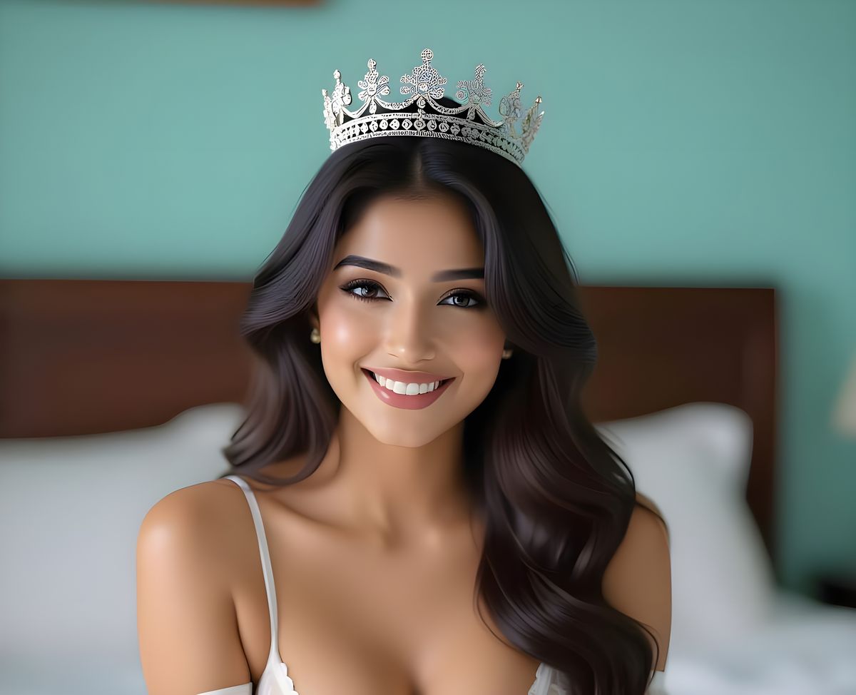 This image shows a young Indian woman with a crown, posing on a bed. The artwork features photorealistic textures, volumetric lighting, and a teal and violet color palette, in a 3D anime art style.