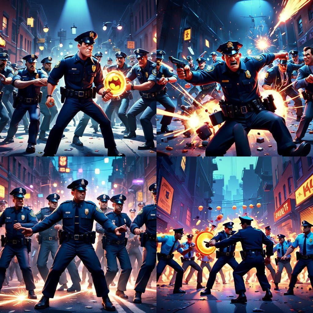 This image captures a dynamic bank robbery scene in a Disney animation style, featuring a colorful and chaotic atmosphere with energetic gangsters and police interactions.
