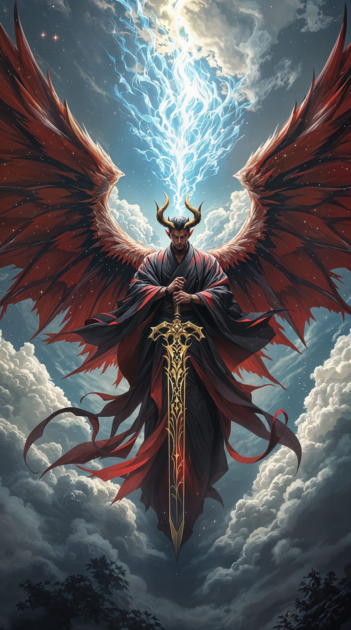 This striking image shows a powerful devil figure with majestic wings, holding a golden sword, set against a dramatic celestial backdrop, blending beauty and darkness.
