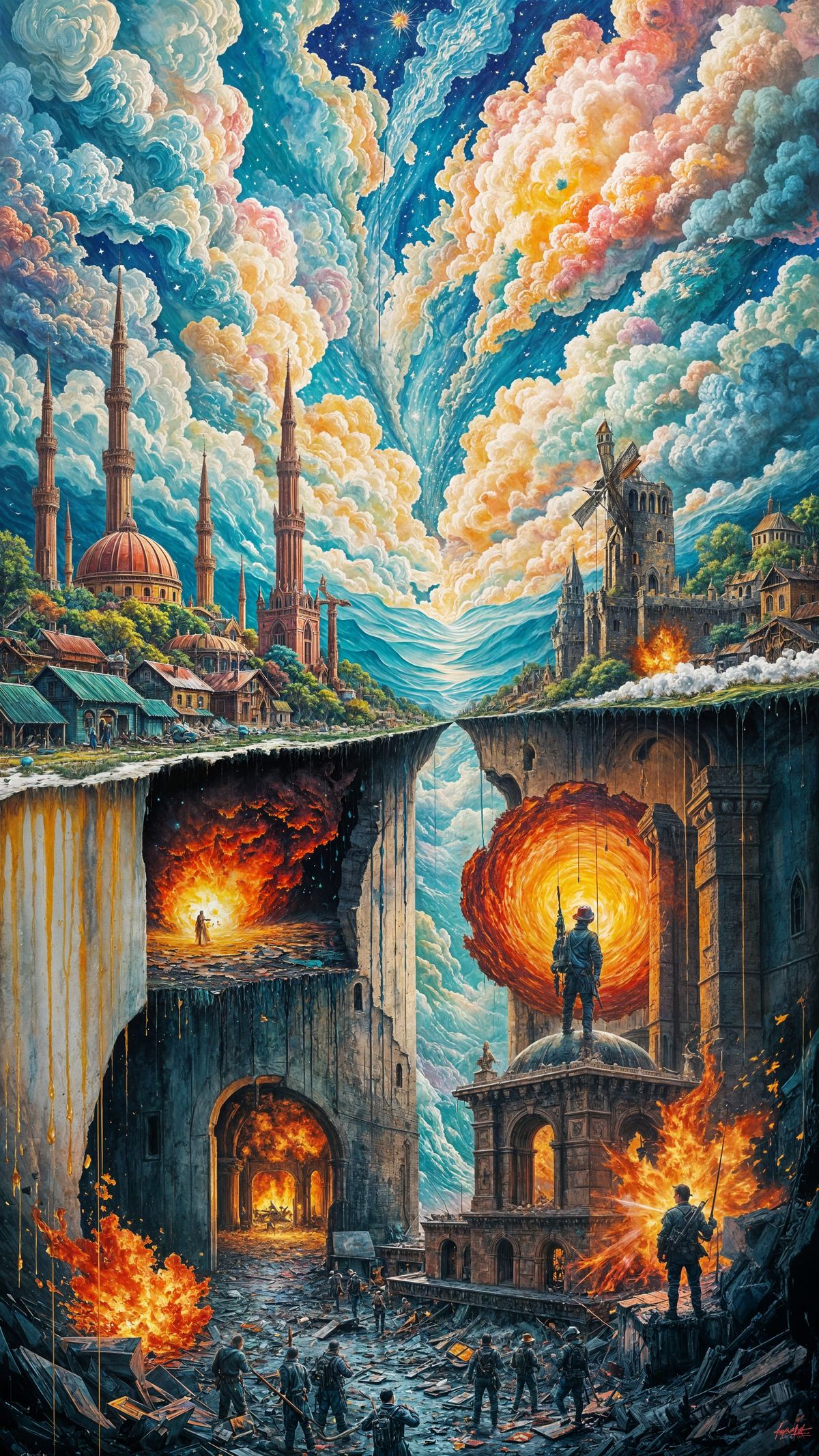 A vibrant fantasy fairyland landscape transitions into a nightmarish, war-torn reality. The image, rendered as surrealist art, features meticulous detail and evokes a sense of both wonder and horror.