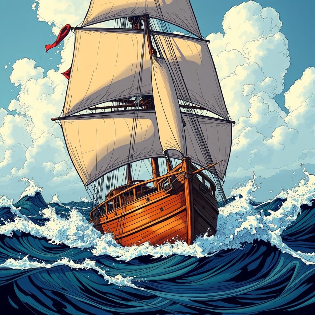 This image shows a majestic sailing ship cutting through choppy waves. The illustration is rendered in a smooth comic book style, with bold lines, vibrant colors, and dynamic textures.