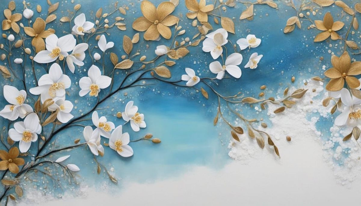 This image presents a surreal, abstract landscape painting featuring floral elements and garden motifs. It blends art deco and chalk art styles with a vibrant color palette.
