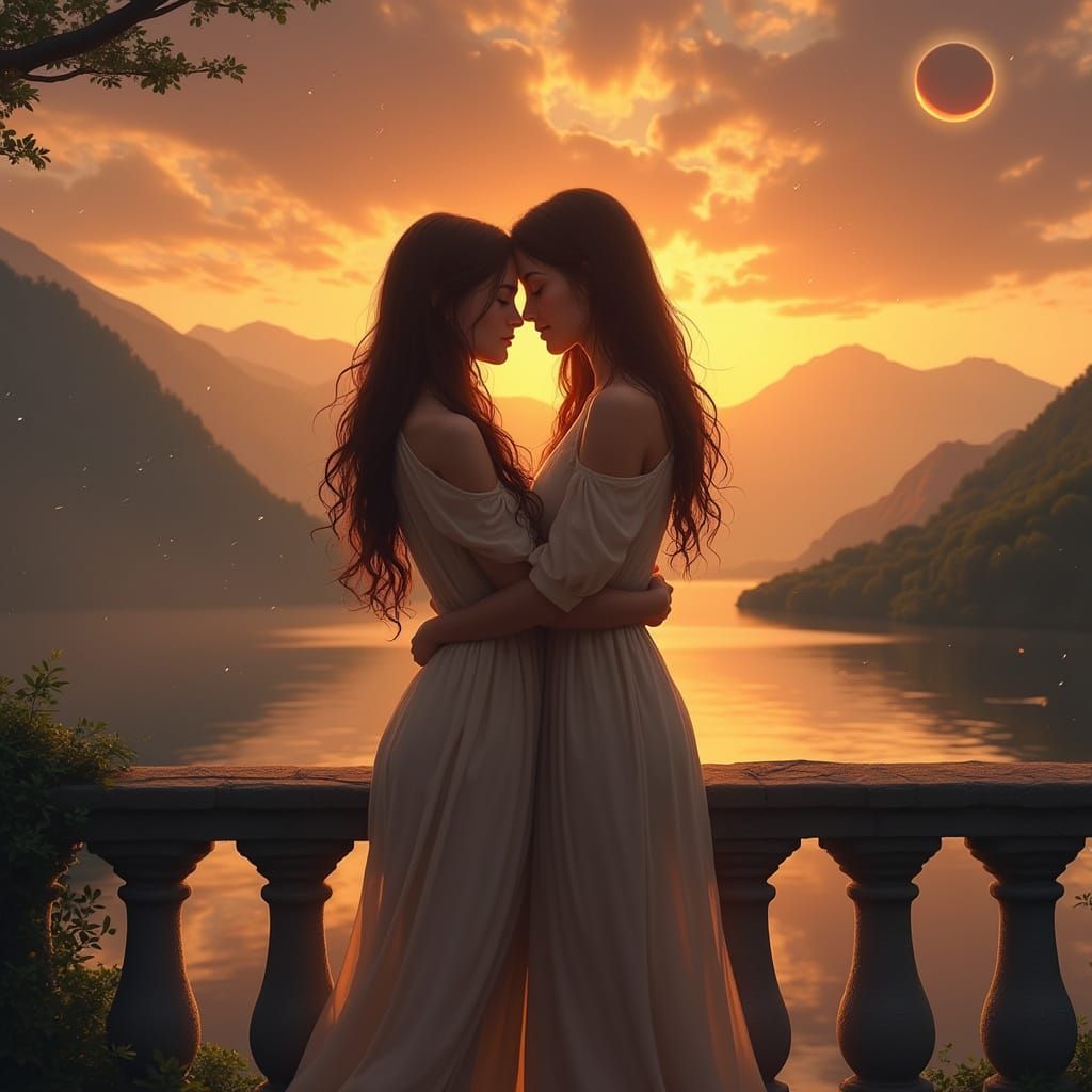 A picturesque image shows two women embracing on a balcony overlooking a lake at sunset. The scene is rendered with golden hues, mist, and fireflies, in a digital art style with photorealistic skin textures.