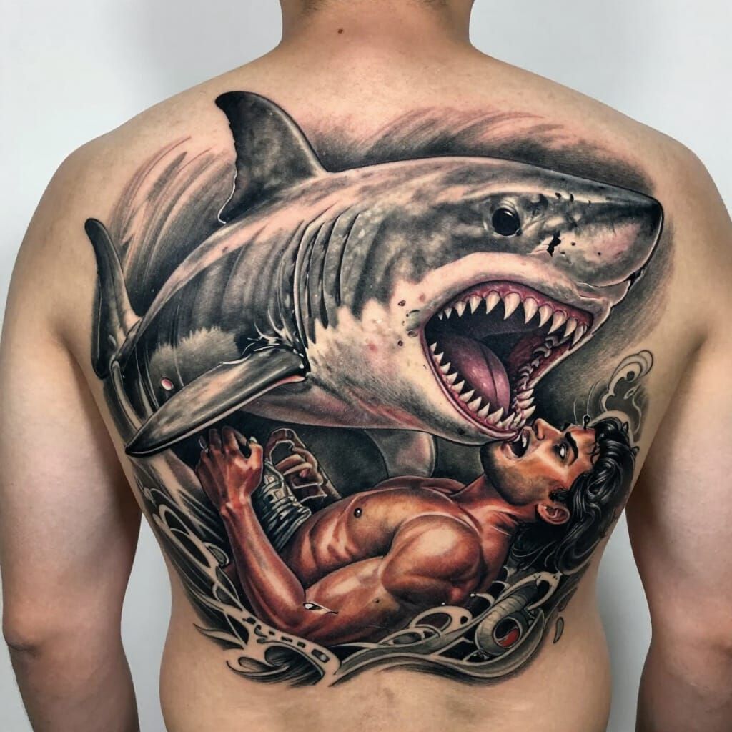 This image showcases a hyperdetailed charcoal drawing of a colorful, realistic tattoo on a man's back. It depicts a dynamic scene of a white shark attacking a human, rendered with vivid colors and intense shading.