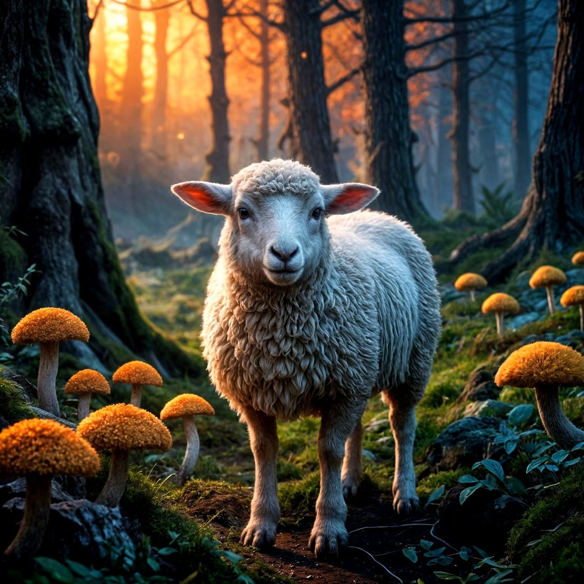 This image shows a nervous lamb in a fantastical landscape. The digital painting features deep colors, intricate details and complementary colors, rendered with a matte finish.