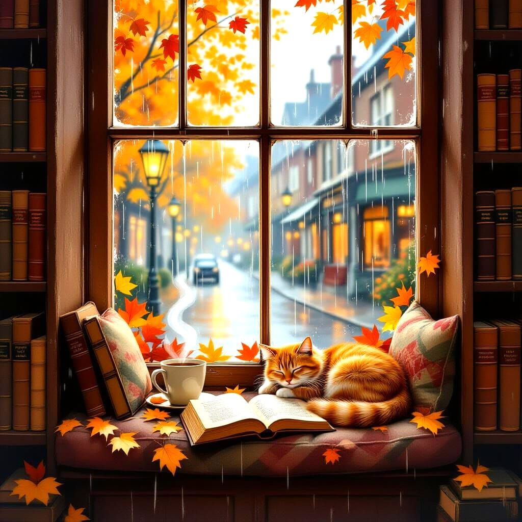 This image shows a cozy vintage bookshop on a rainy autumn day. Soft amber light filters through the rain-streaked window, illuminating the warm, nostalgic scene in storybook realism style.