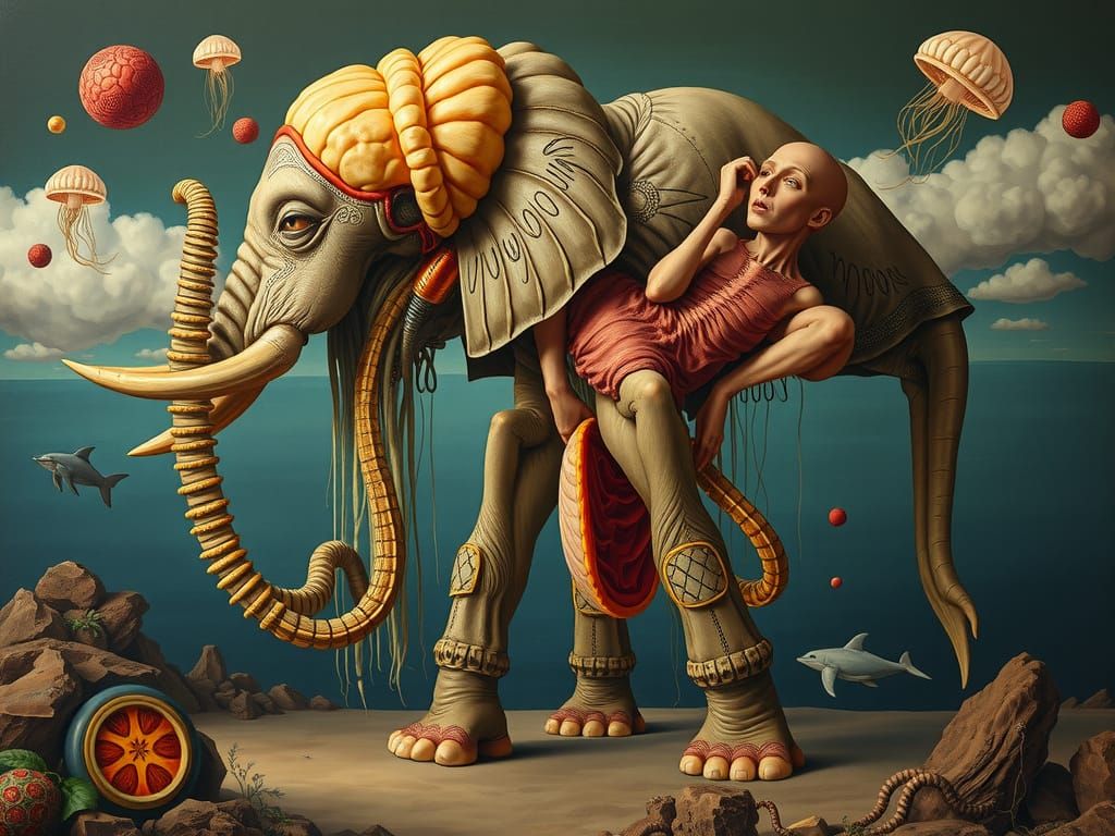 This image depicts a grotesque, surreal hybrid creature combining Egyptian, jellyfish, elephant, and dolphin elements, featuring internal organs and a beak, in a style reminiscent of early 20th-century Symbolist painting.