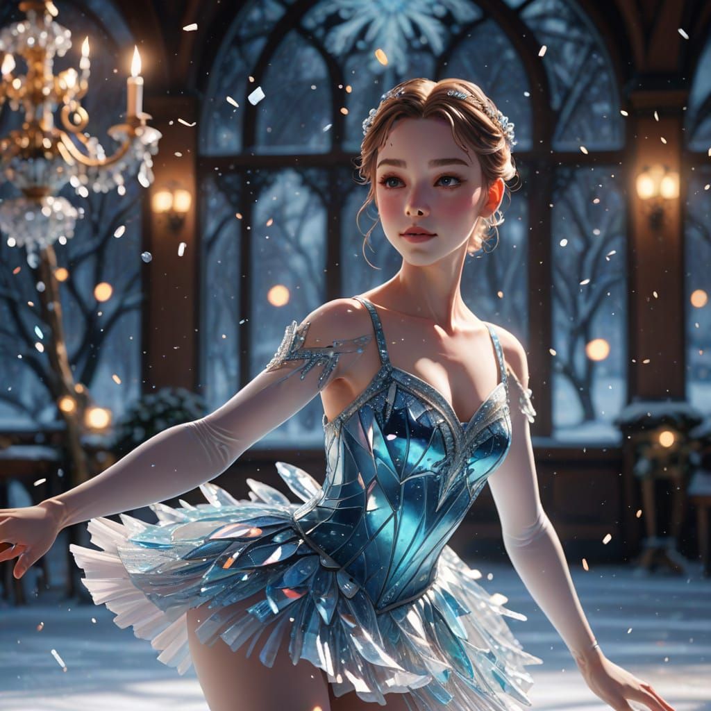 A close-up of a ballet figure skater gliding on ice. This vibrant 3D anime art features sparkling ice shards and fluid skirt movements in soft, warm lighting.