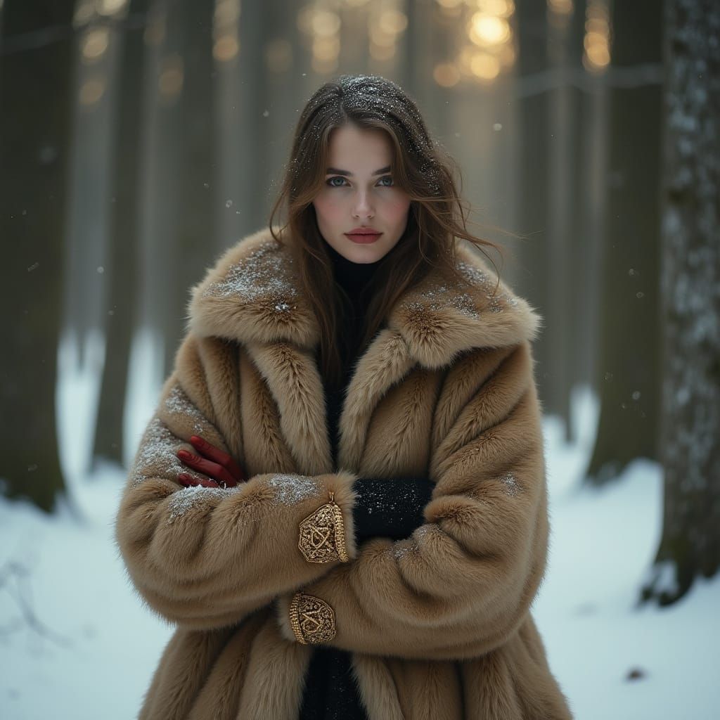 This image depicts a woman wrapped in lavish fur coats, posing in a serene snow-covered forest, with intricate details and a warm, golden light evoking a sense of elegance and refinement.