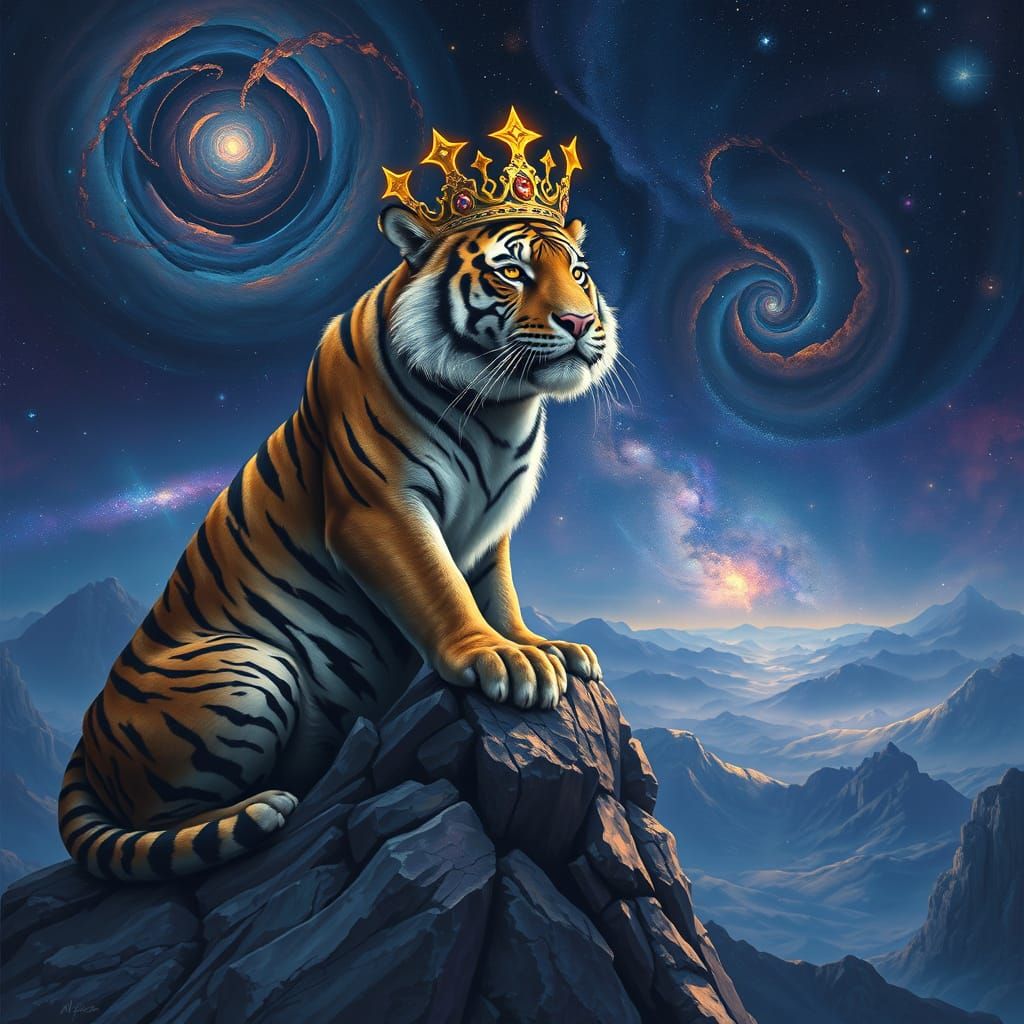 A digital painting of a tiger wearing a crown of stars and sitting on a rocky cliff. The tiger overlooks a cosmic landscape with swirling nebulas, rendered with rich colors and intricate details.