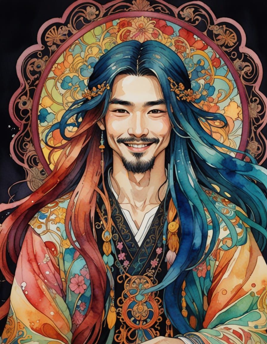 This image showcases a medium shot of a smiling man with long hair, painted in a vibrant watercolor and ink style with intricate lineart. Ethereal lighting and Japonism influences create a unique, colorful aesthetic.