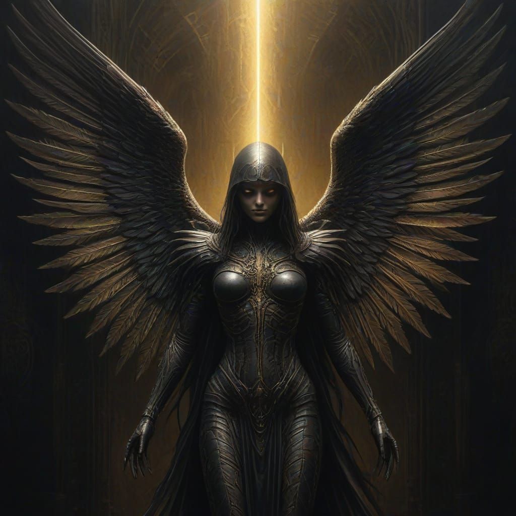 This image features a striking angel alien with intricate, delicate wings and dark, ornate clothing, set against a backdrop of mysterious shadows and golden light. Inspired by the dark, gothic aesthetic of H.R. Giger's oil paintings, this piece is a masterclass in dramatic lighting and eerie atmosphere.