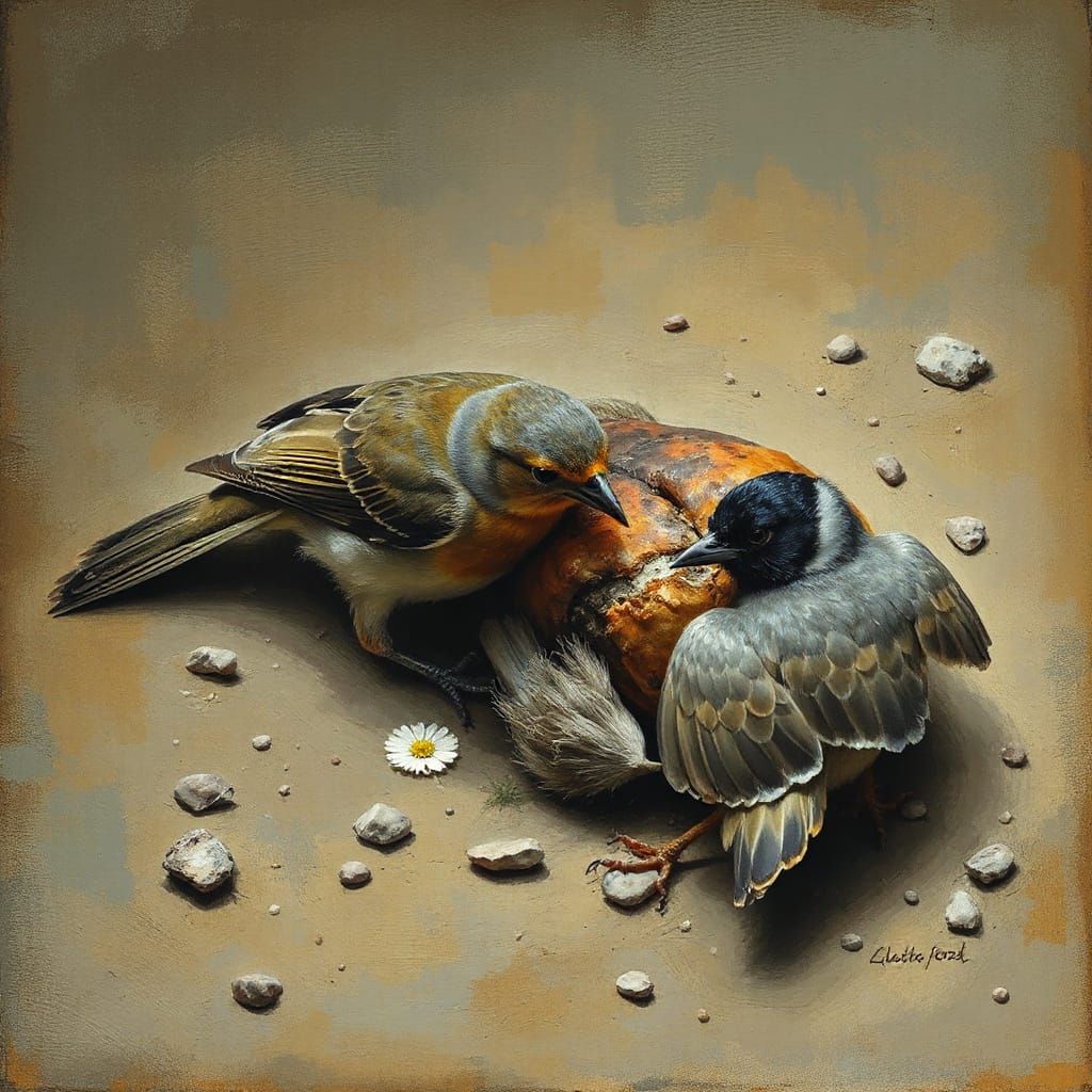 This image shows a small bird clinging to another bird's corpse in a natural setting. The scene evokes a sense of deep sorrow rendered with muted colors, reminiscent of classic naturalism.
