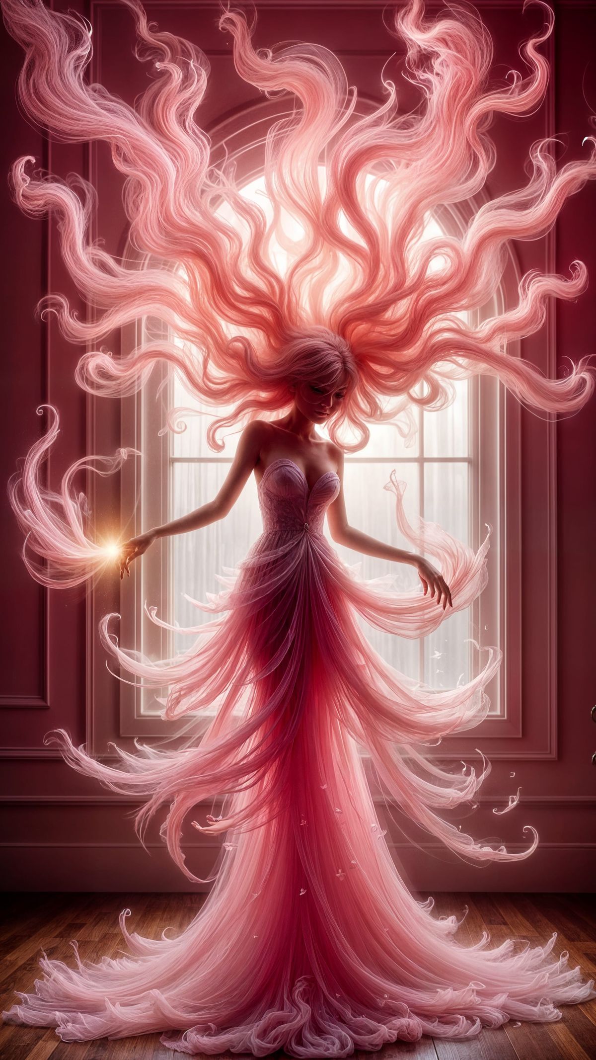 This image depicts a powerful tornado elemental interacting with a woman in a cozy pink bedroom. The elemental displays immense wind power, creating a dramatic scene.