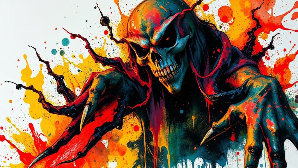 This image is a mesmerizing blend of vibrant colors and intricate details, depicting a ghostly vampire in a dynamic, liquid-like environment, reminiscent of action painting and watercolor art.