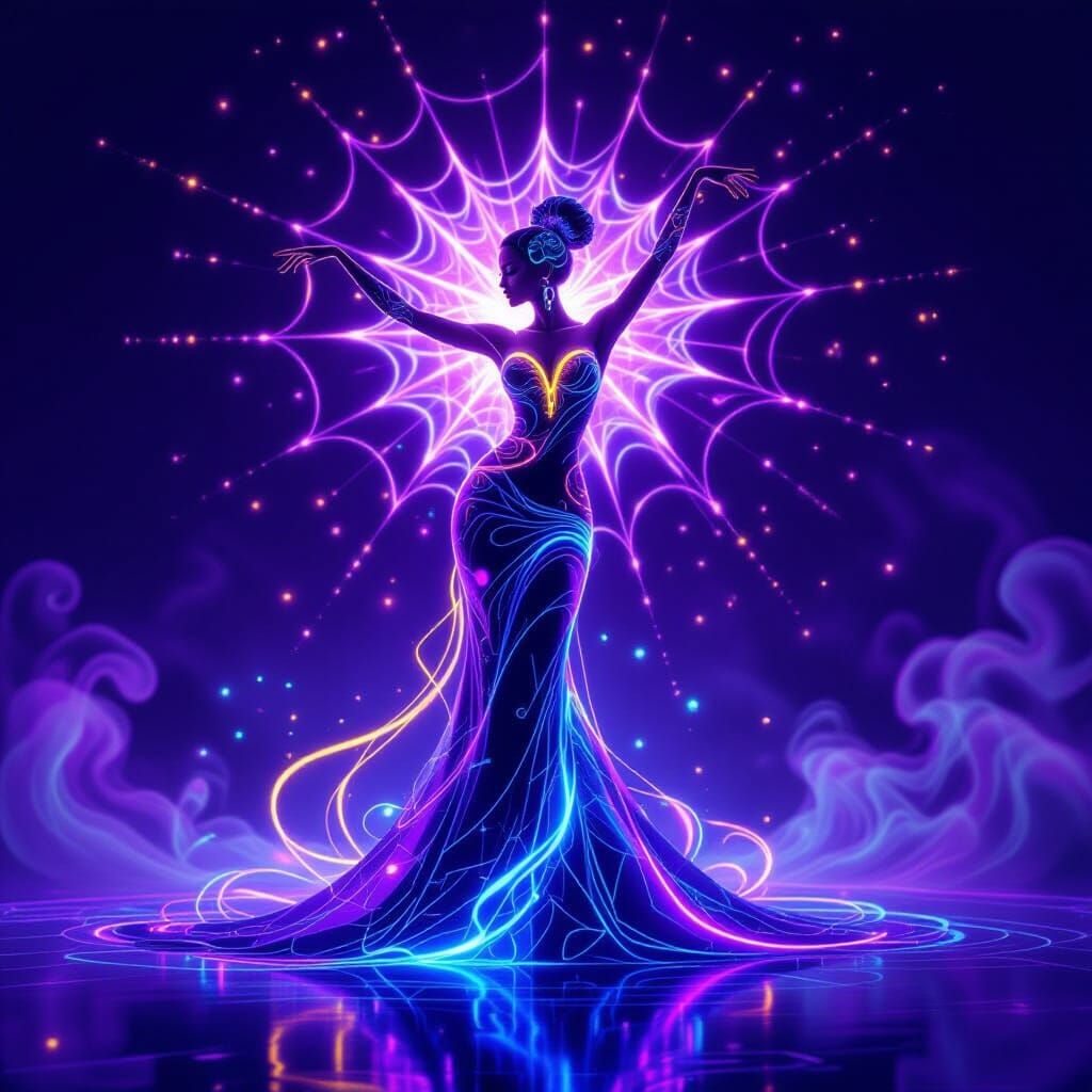 Abstract digital cobwebs art style : Standing proud against a deep purple backdrop, a magnificent digital eletctric light cobwebs cyber-enhanced flamenco dance figure radiates with otherworldly energy cobwebs. Its digital cobwebs surface pulse with electric blue and magenta hues, while streams of neon ...