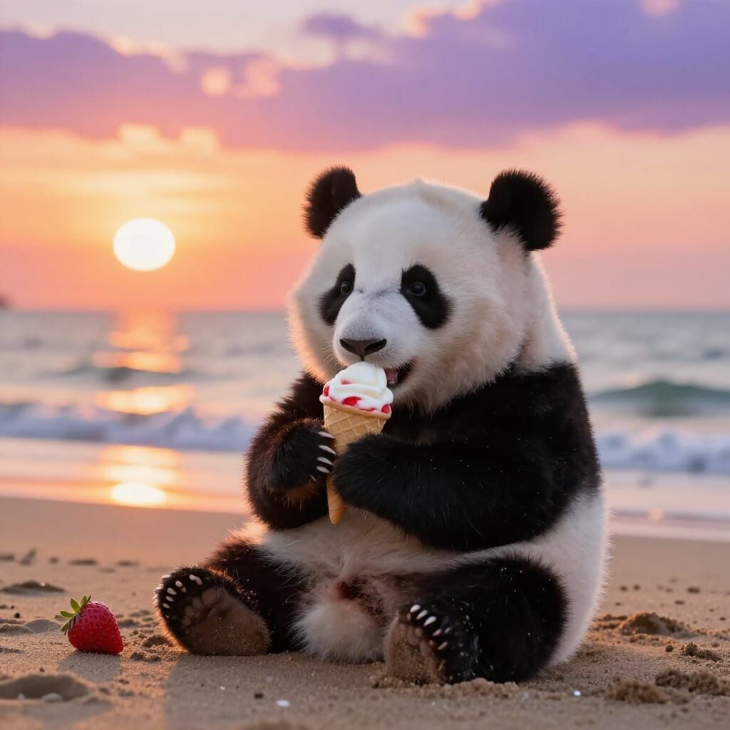 A photorealistic image of a baby panda on a beach eating strawberry ice cream during a vibrant sunset. Cinematic lighting and shallow depth of field create a warm, golden-hour atmosphere.
