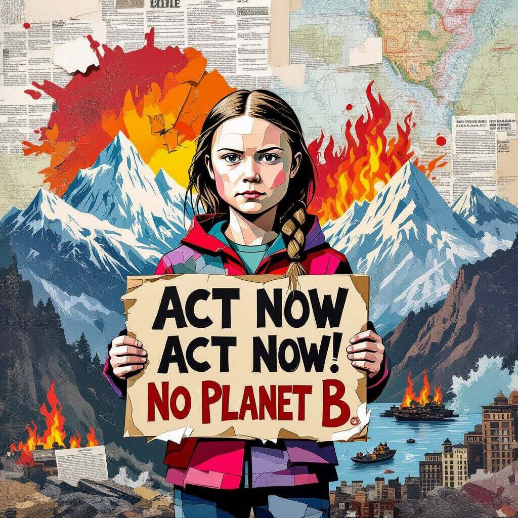 This image shows Greta Thunberg constructed from layered paper, holding a protest sign. The collage includes newspaper clippings, maps, and diagrams depicting climate change impacts, rendered as digital art with a handmade feel.