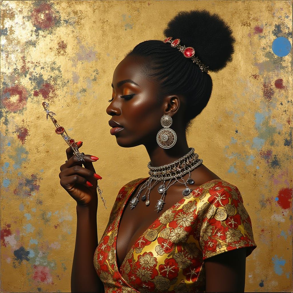 This AI-generated image showcases a sophisticated woman adorned in a stunning, high-fashion ensemble. The artwork reflects a blend of abstract expressionism and vibrant textile influences.