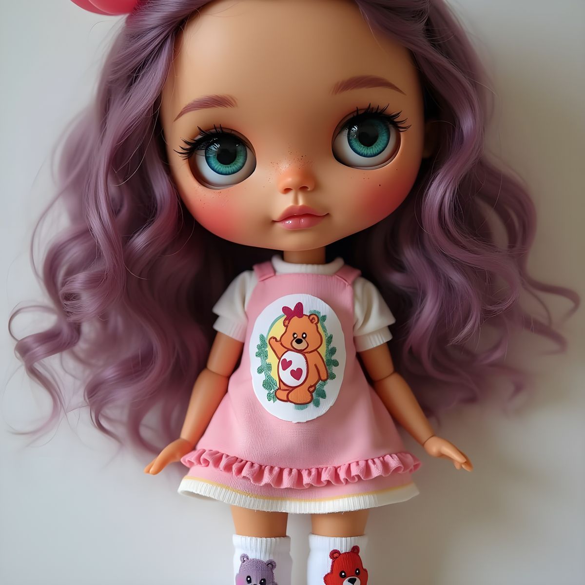 This vibrant Blythe doll features warm, golden skin, loose curls, and bright blue eyes with a green ring. She wears a vintage-inspired Care Bear dress and colorful socks, blending soft pastels with bold graphics.