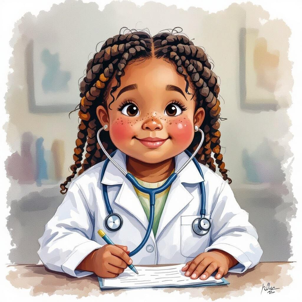 A cute, chubby Black girl with braids and freckles plays doctor. She wears a white coat and uses a toy stethoscope as she imagines her future. The image is in a vibrant watercolor style.