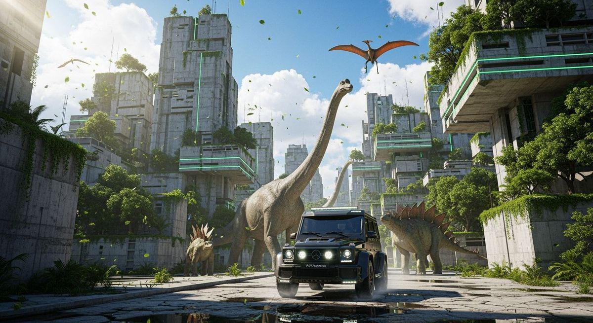 This image showcases a futuristic, brutalist concrete bunker district intertwined with lush jungle and neon-lit skyscrapers. Dinosaurs roam freely as a luxury SUV speeds through the scene under bright, hyperrealistic sunlight.