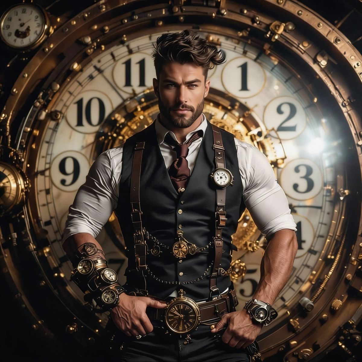 This image shows a hyper-muscular, handsome steampunk man inside a zeppelin filled with clocks and watches. Photographed with bokeh and natural light for sharp focus.