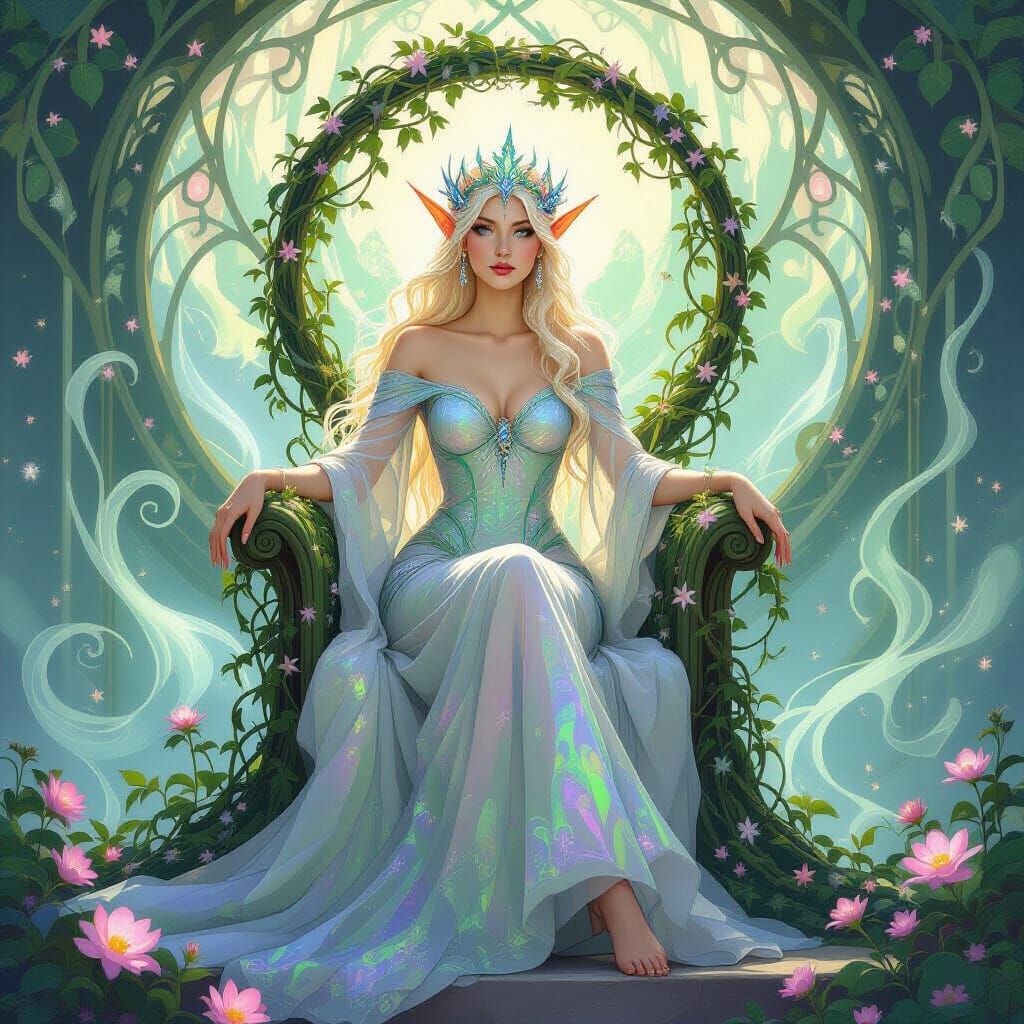 A majestic elven queen with flowing starlight hair sits on a floral throne, adorned in an iridescent gown amidst glowing flora and swirling mists. This image showcases an art nouveau aesthetic.