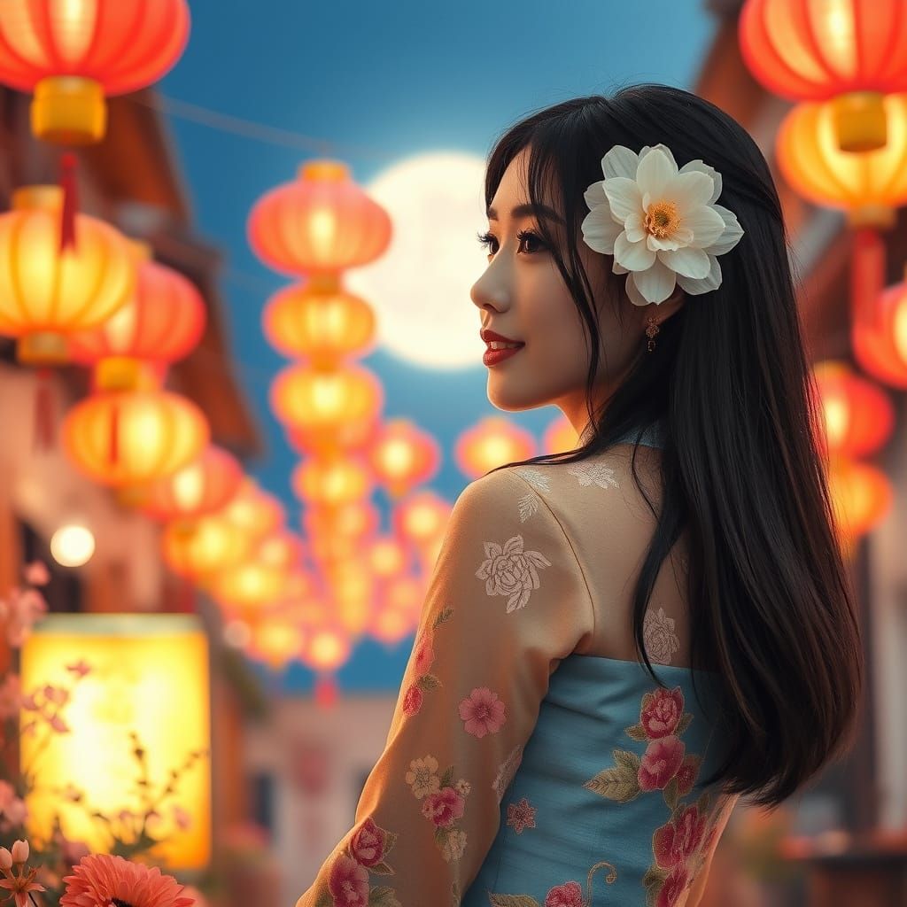 This image shows a Vietnamese woman in a traditional Ao Dai dress during the Tet celebration. The scene is set on a moonlit street surrounded by lanterns and flowers, captured with delicate watercolor textures and soft lighting.