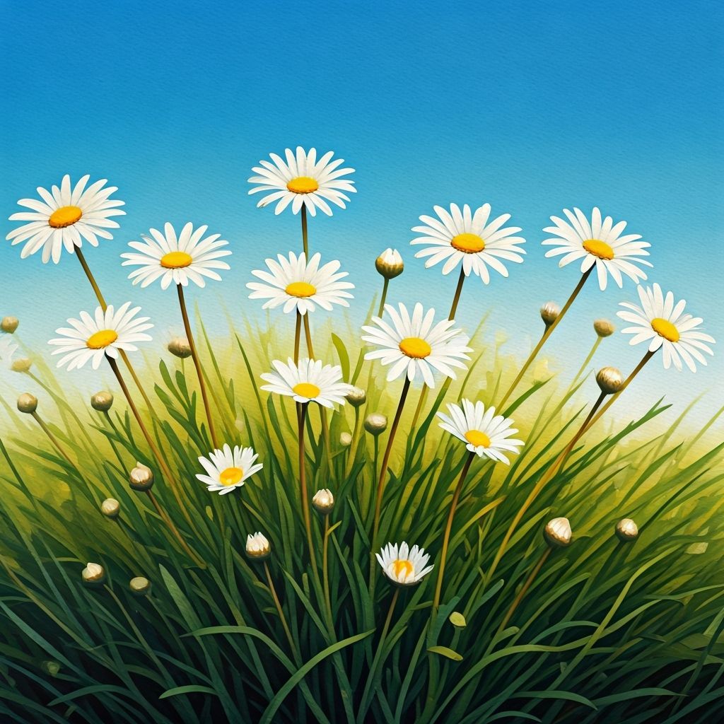 A watercolour painting shows Namaqualand daisies in bloom, gently swaying in a meadow under a spring sky. The artwork evokes a dreamy aesthetic using bold colours and soft brushstrokes.