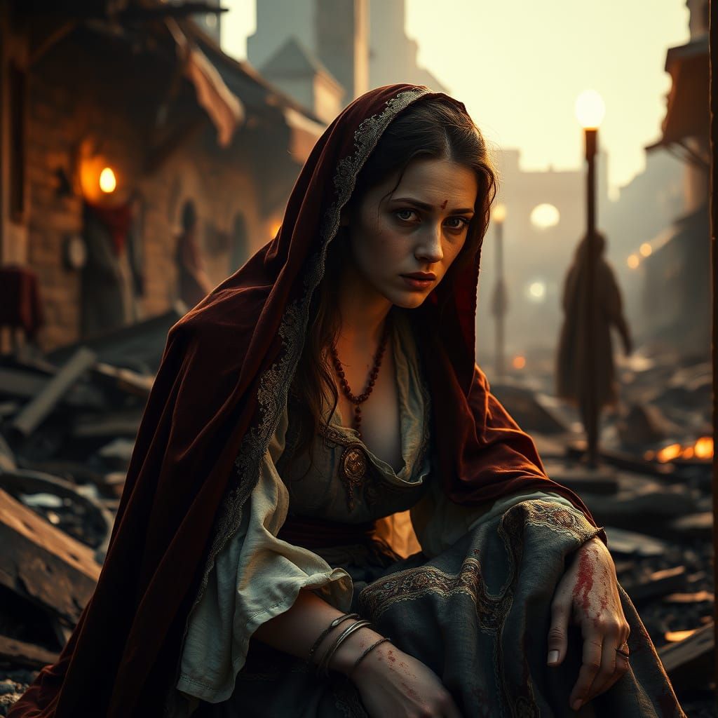 This haunting image captures a beautifully dressed medieval woman, battered and bruised, amidst the devastation of a ravaged marketplace, with a cinematic color palette and moody atmosphere reminiscent of a sweeping epic film.