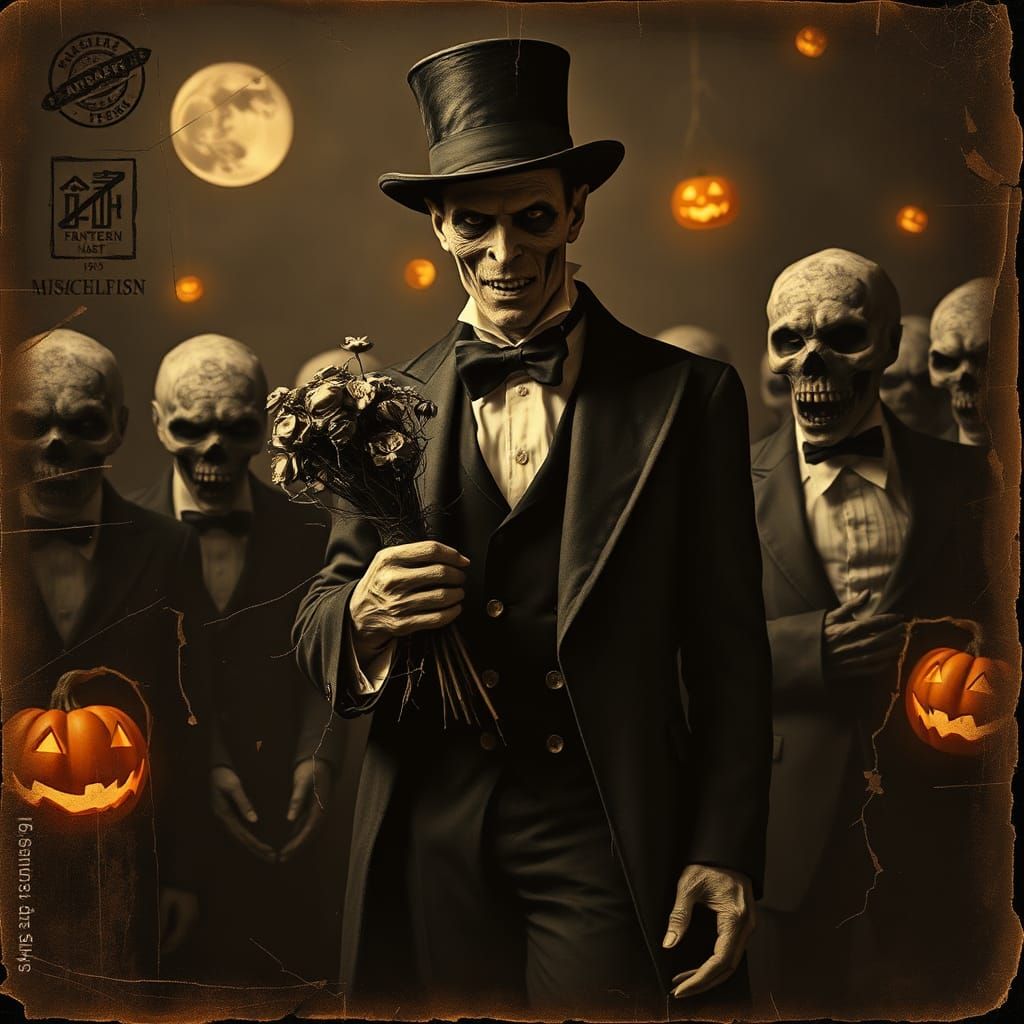 This image captures Nosferatu at a monster prom on Halloween night, rendered as a sepia-toned antique photograph. The scene blends gothic romanticism with eerie mystery, featuring cobwebs and eerie shadows.