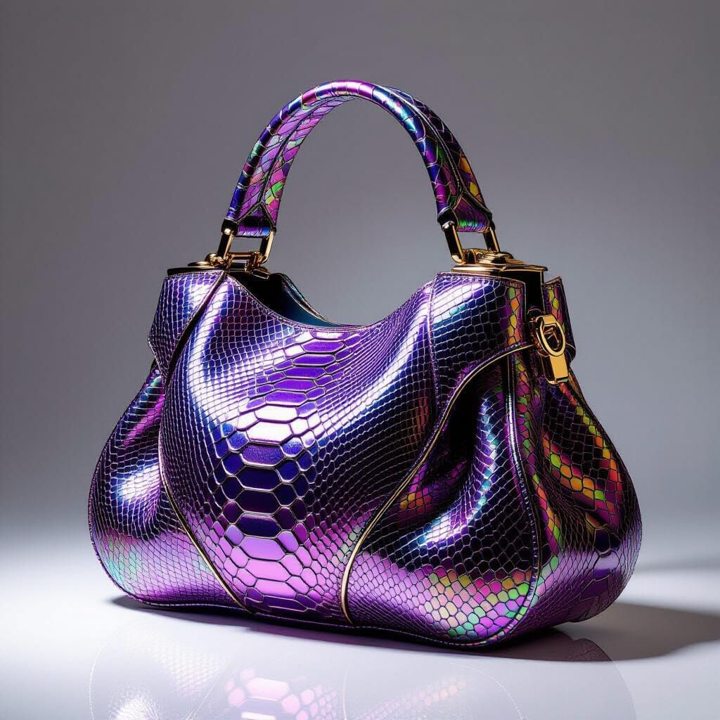 This image showcases a unique handbag inspired by surrealist art and organic shapes, featuring shimmering python leather and chrome accents. Rendered in a hyperrealistic 3D style with dramatic lighting, it has a flowing, sculptural form.