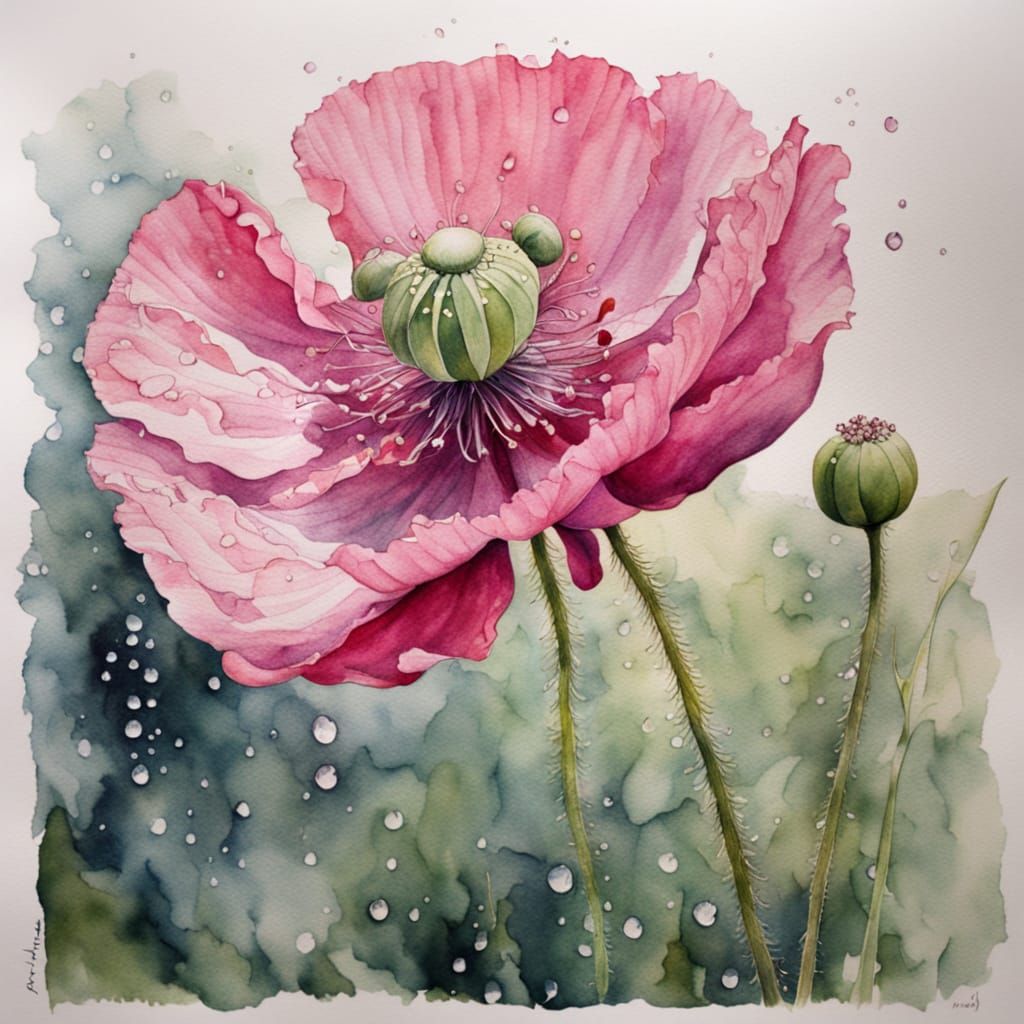 This image shows a close-up watercolour painting of a deep pink opium poppy adorned with glistening dewdrops. Soft light highlights the translucent petals and reflections in the water droplets.