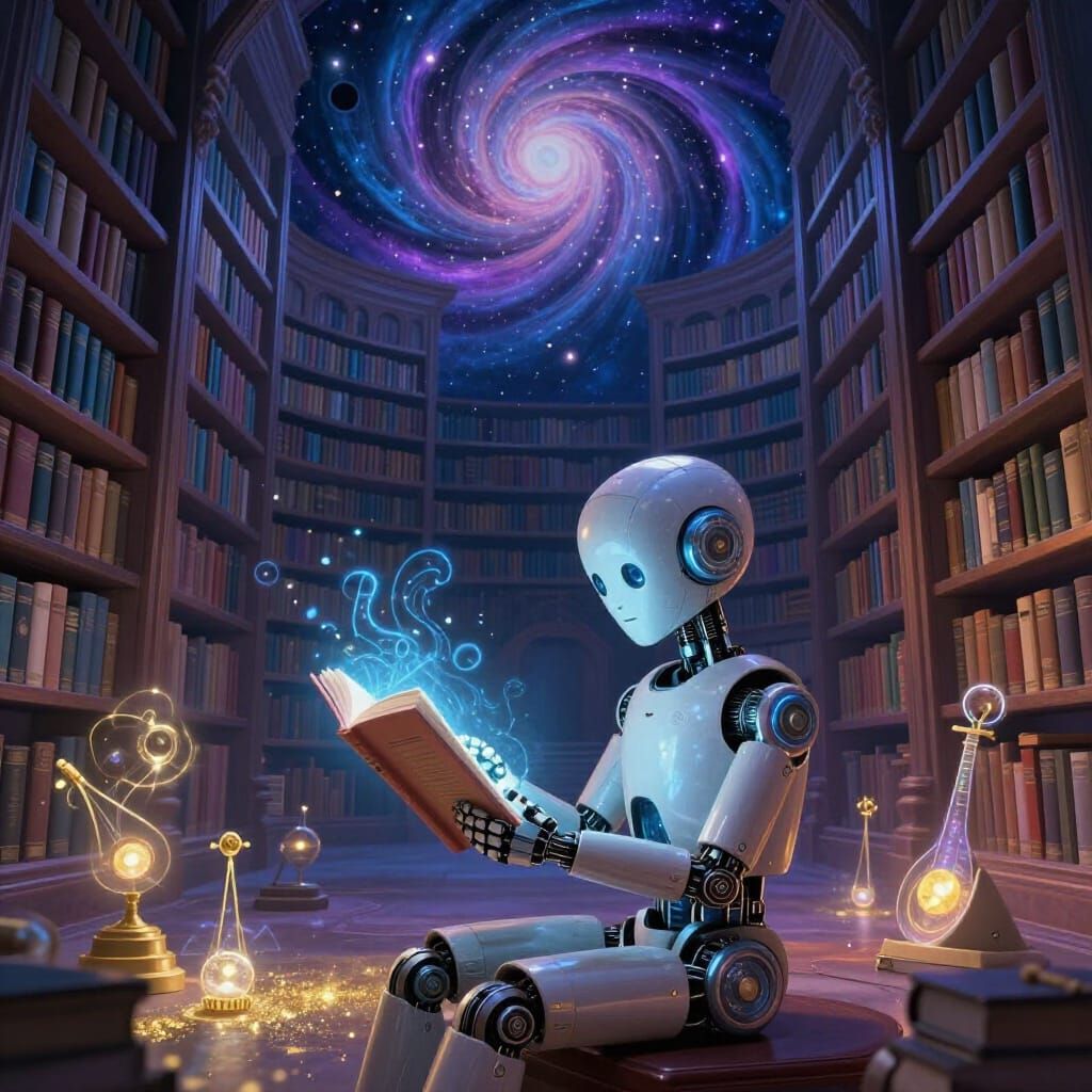 This image shows an android student studying a holographic book in a vast library merging with a cosmic nebula. Ethereal energy and otherworldly lighting create a surreal, retro-futuristic scene.