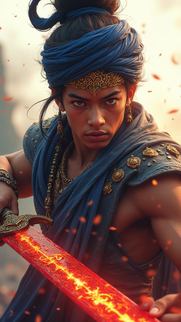 A striking picture of an anime warrior with piercing eyes, jeweled turban, and crimson blade. The hyper-stylized image depicts a celestial battlefield with glowing runes and intense colors.