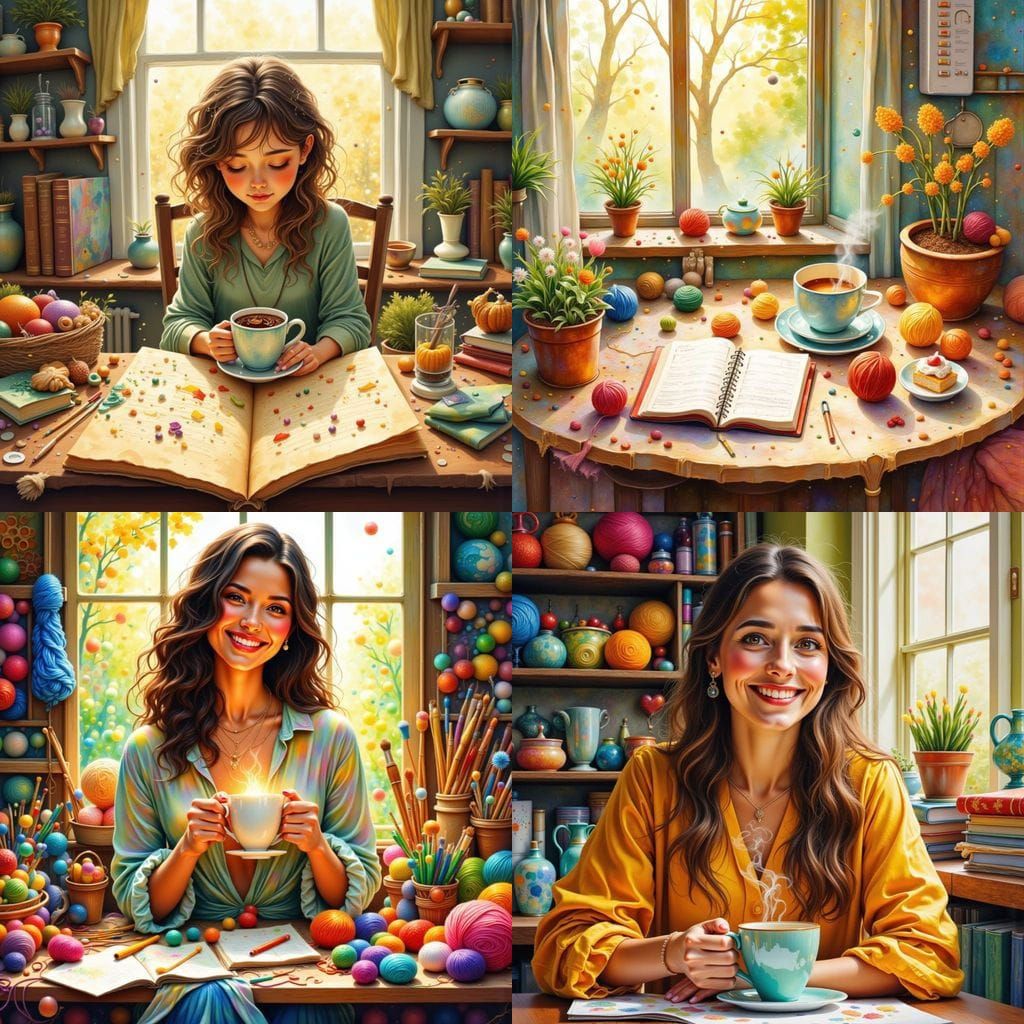 This image captures a fresh start to the year with a cup of coffee, embodying a positive attitude and a heart full of love. Abstract elements and spangles suggest a creative, evolving journey.