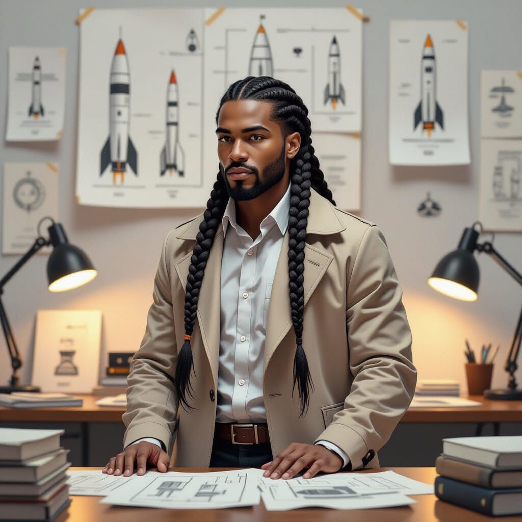 This image shows a Black male scholar and rocket designer in his study, surrounded by rocket plans and books. Rendered in concept art style with dramatic lighting and rich, earthy colors.