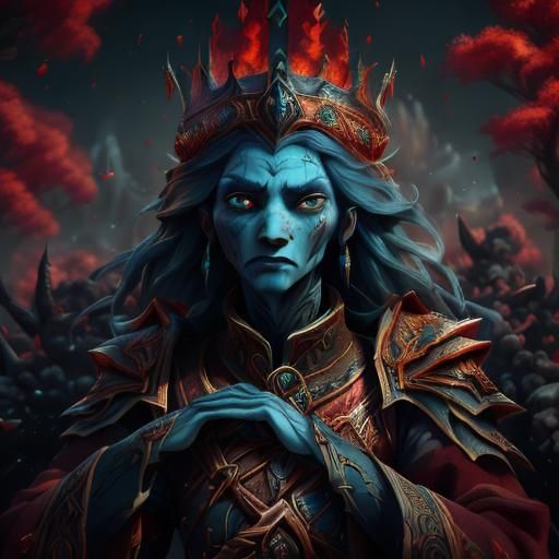 A striking picture of Queen Rune in a fantasy concept art style. The image features intricate details, deep colors, and complementary color schemes, rendered in 8k resolution.