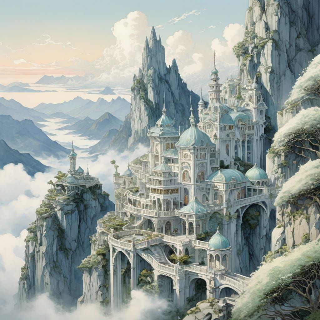 This image depicts a breathtaking, dreamy city carved into the peak of a mountain, featuring delicate marble architecture, intricate filigree details, and a serene atmosphere, reminiscent of the works of Gustav Klimt and Alphonse Mucha.