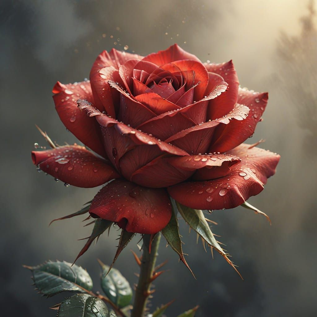 This image is a highly detailed, close-up watercolor painting of a single red rose, featuring delicate petals, prominent thorns, and subtle texture, set against a muted monochromatic background with warm golden lighting, creating a captivating and elegant piece of fantasy concept art.